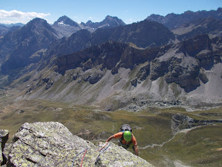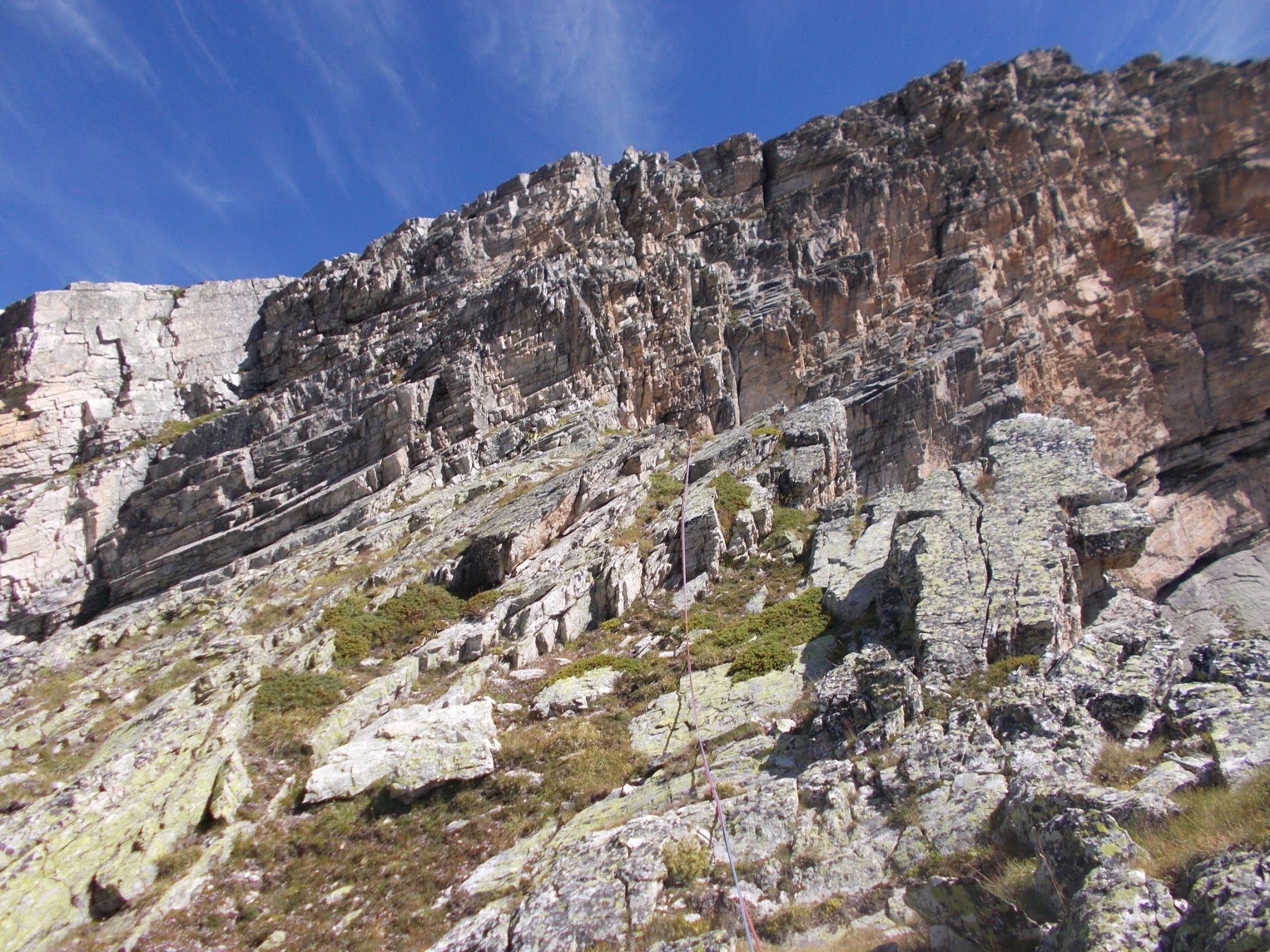Percorro subito il quinto tiro (III), traversando facile a sinistra fino a riprendere il filo dello spigolo, cge sale sempre più verticale, su terreno delicato in quanto un po' instabile: